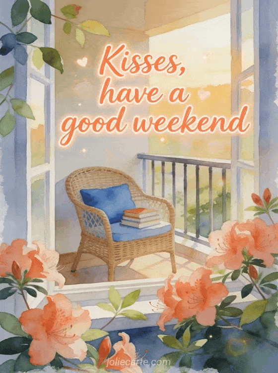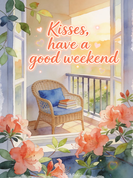 Share a warm weekend greeting with coral watercolor lettering, azalea blossoms over the border, a cozy balcony, a wicker chair with a blue cushion, and stacked books. Discover also a lots of kisses and great weekend, a good weekend and big kisses card, or a kisses great weekend greeting.