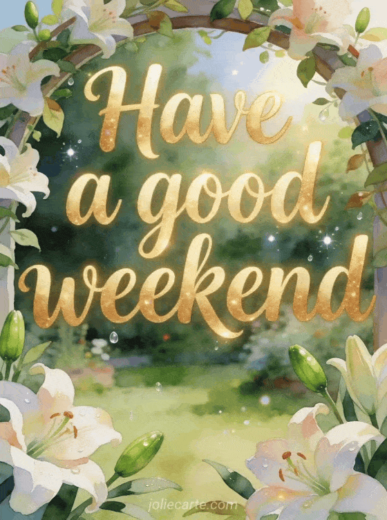 Wish a beautiful end of the week with watercolor lettering, lily blooms, new leaves, and a sunlit spring garden arch full of renewal. Discover also a great weekend kisses images card, a lovely weekend animated kisses card, or a good weekend kisses image card.