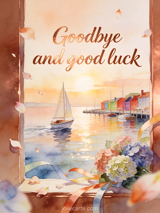 Send goodbye and good luck with warm copper script, a small sailboat leaving a colorful harbor, hydrangeas and ribbon streamers. Discover also text to wish good luck, good luck with your exam image or good luck exam card.
