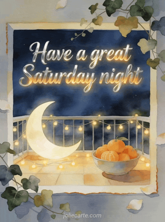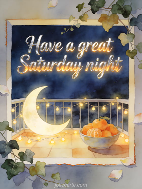 Wish a great Saturday night with a crescent moon above a cozy terrace, glowing fairy lights, a bowl of mandarins and soft ivy in watercolor night colors. Share this peaceful card and discover also a happy saturday snow gif, a saturday have a good day gif or happy saturday kisses images.