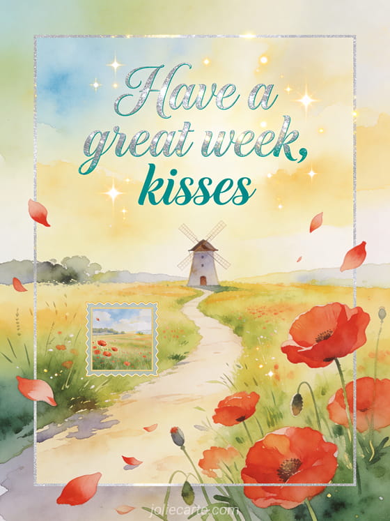 Share an uplifting countryside greeting with red poppies, drifting petals, a sunny meadow path and a small windmill in soft golden light. You can also send very beautiful week kisses, happy Monday great week kisses or lovely Christmas week kisses.