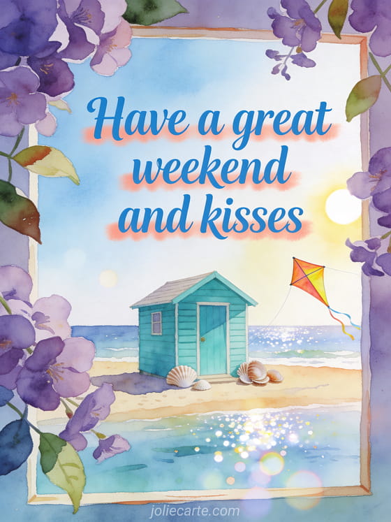 Wish a great weekend and send kisses with a turquoise beach hut, seashells, a bright kite and violet blossoms by a sunny shore. Discover also great weekend big kisses, weekend sweet kisses or weekend kisses.