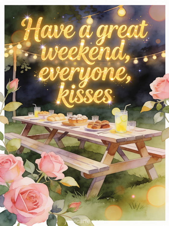 Share a friendly weekend message with pink roses, a long picnic table, pastries, lemonade and glowing fairy lights. Discover also big kisses and great weekend, a great weekend big kisses gif or happy Friday good weekend kisses.