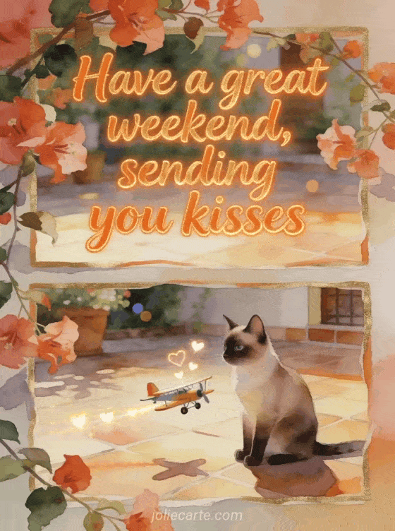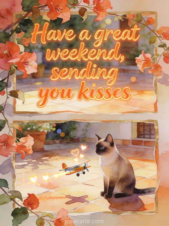 Send a great weekend full of kisses with a realistic watercolor courtyard scene where bougainvillea cascades around a Siamese cat and a little toy plane trailing glowing hearts. You can also share hi there happy weekend kisses, great weekend everyone kisses, or big kisses and great weekend.