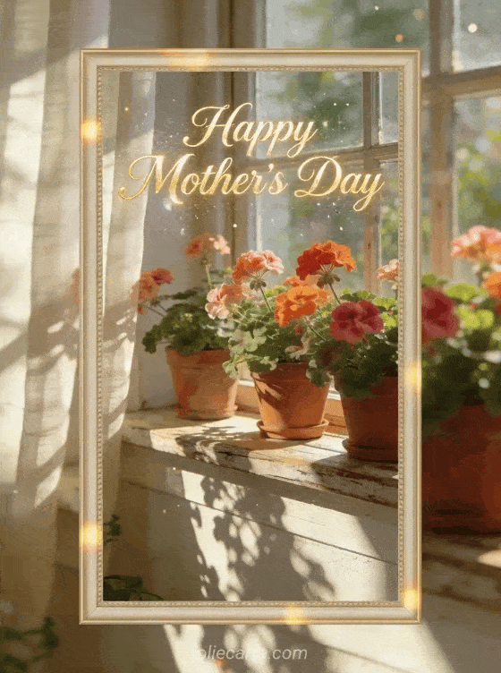 Share a welcoming Mother's Day card with champagne script, a photorealistic window garden, terracotta pots overflowing with geraniums, and warm sunlight. Discover also a Mother's Day picture, drawing for Mother's Day, or a poem about Mother's Day.