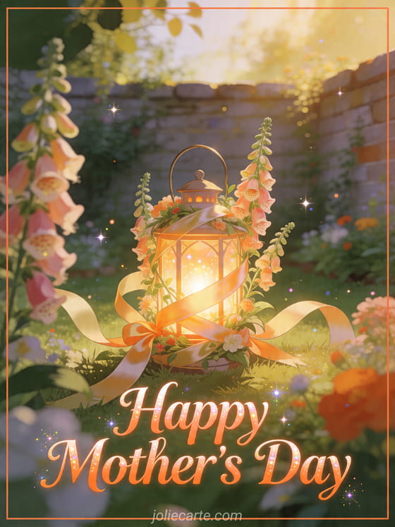 Share a handmade Mother's Day card with a glowing lantern wrapped in foxgloves and satin ribbons, set in a radiant walled garden with sparkling details. Discover also Mother's Day poetry kisses, happy Mother's Day super mom, or a letter for Mother's Day.