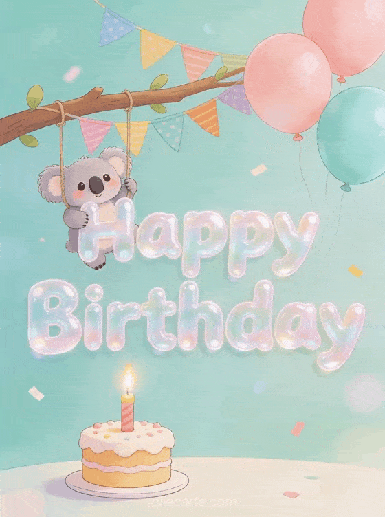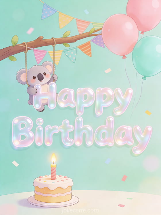Celebrate a child's birthday with this kawaii greeting card featuring an adorable koala. Discover also a cute birthday ecard or a birthday ecard for kids.