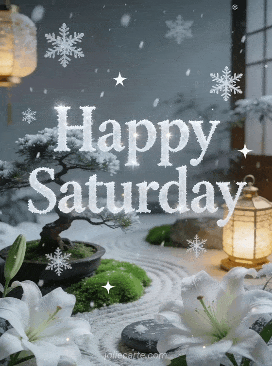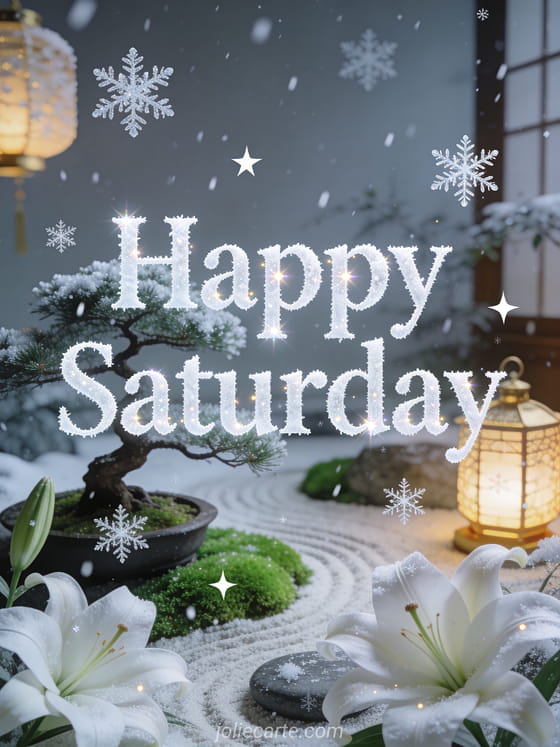 Send a peaceful Happy Saturday card with frosted white letters, snowflake stickers, a zen garden with bonsai and emerald moss, majestic white lilies and soft falling snow warmed by golden lantern light. Discover also happy sunny Saturday images, happy Saturday my friends image or animated image happy saturday.