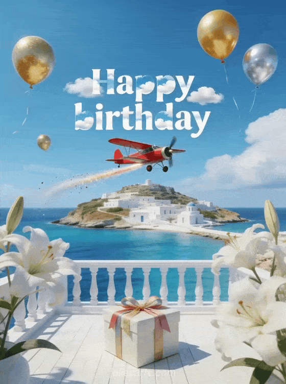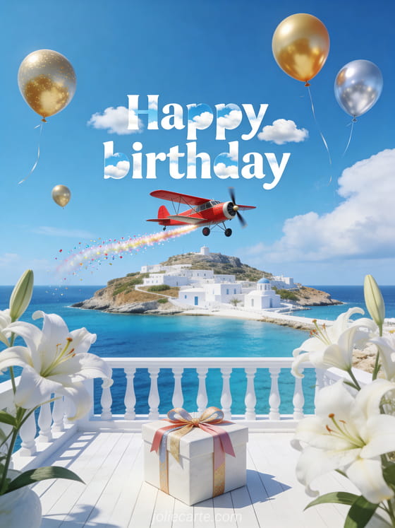 Share a vacation-inspired birthday wish with cloud-like white lettering, a white Greek island, cobalt sea, a vintage red propeller plane, white lilies, a wrapped gift, gold and silver balloons, and a festive trail in the blue sky. You can also send an arab new year 2024 card, happy birthday wishes, or a wish happy birthday from a distance card.
