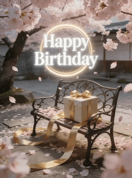 Send this free animated happy birthday card with a cherry tree in bloom raining petals and a gift on a wrought iron bench. Discover also a free animated musical birthday card or a birthday animated gif.
