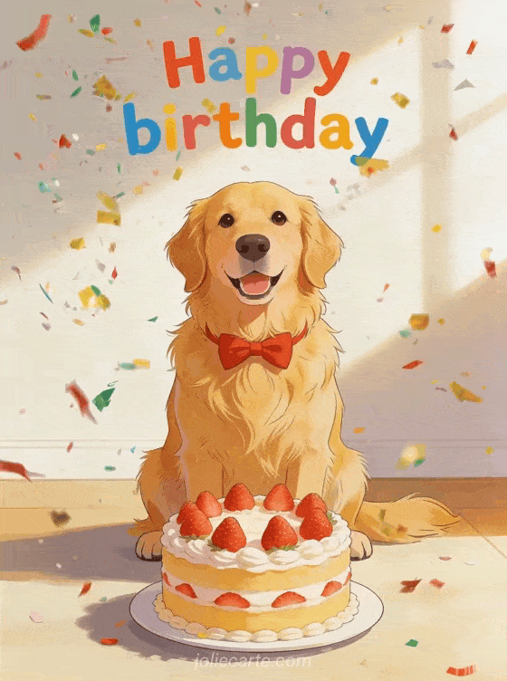 happy birthday animated gif A joyful birthday greeting with a sweet golden retriever and festive confetti.