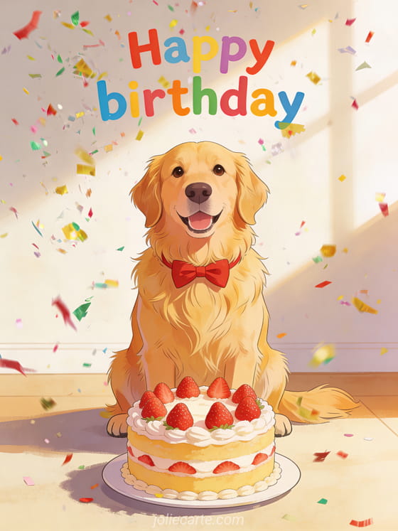 Share this photorealistic birthday card featuring a golden retriever in a red bow tie beside a strawberry birthday cake. You can also browse animated birthday card, animated happy birthday, and free animated birthday cards adults.