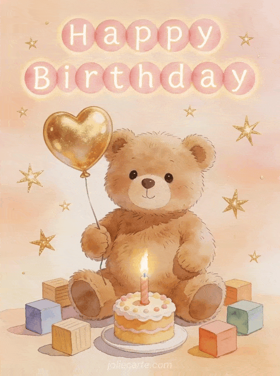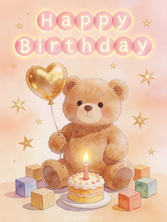 Send this adorable happy birthday card featuring a sweet little teddy bear holding a golden heart balloon surrounded by colorful wooden blocks and a miniature cake with a candle. A tender way to celebrate a baby's birthday. Discover also a outdoor birthday party card or a funny birthday card for kids.