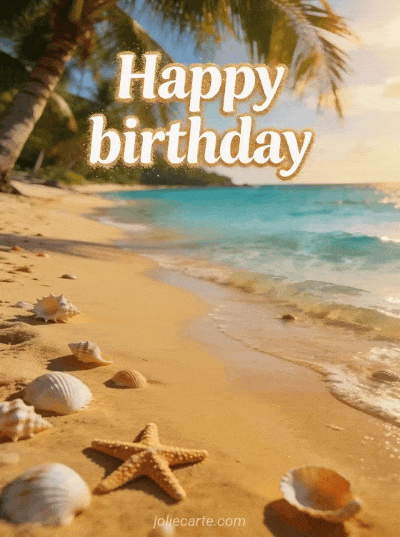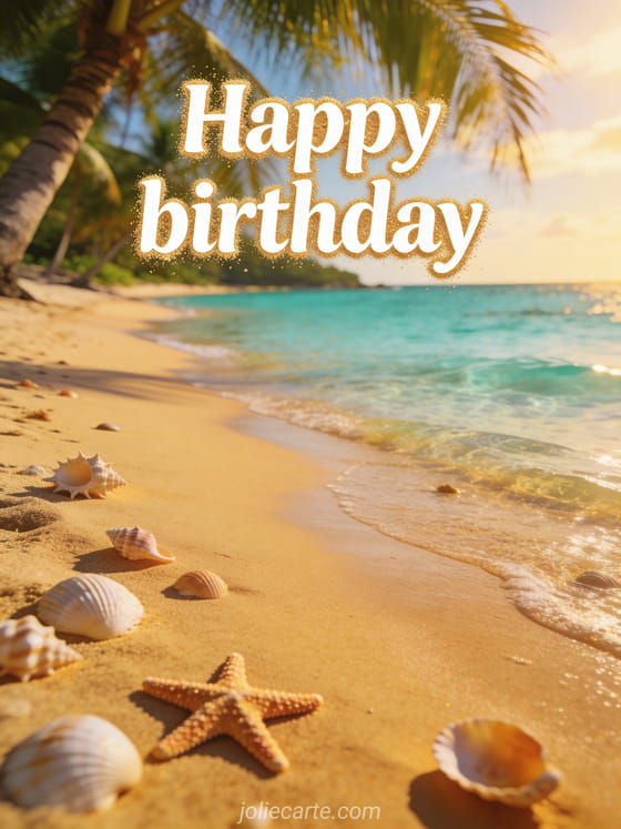 Celebrate with a happy birthday beach card featuring crystal water, soft sand, palm trees, and seashells in golden light. Discover also happy birthday car, peaceful happy birthday, and happy birthday exotic flowers.