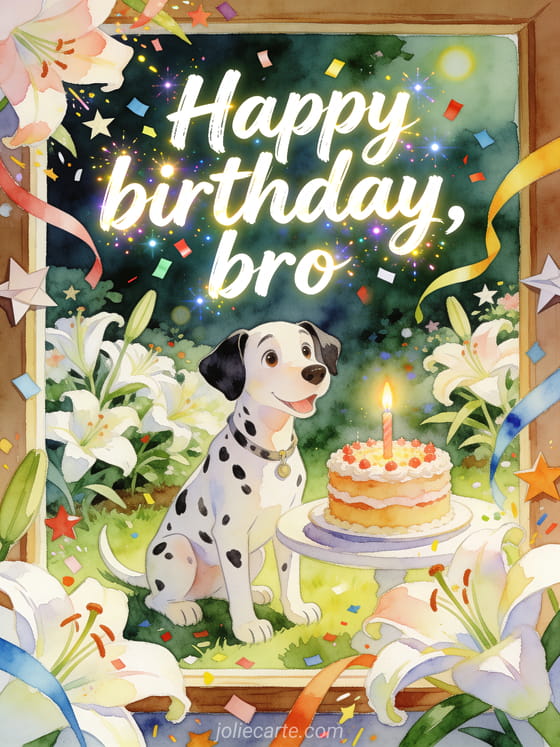 Send a cheerful birthday greeting to your bro with a playful dalmatian, glowing confetti and a candlelit cake. Discover also a happy birthday sms for his big brother, a happy birthday my little brother sms or a happy birthday little brother image.