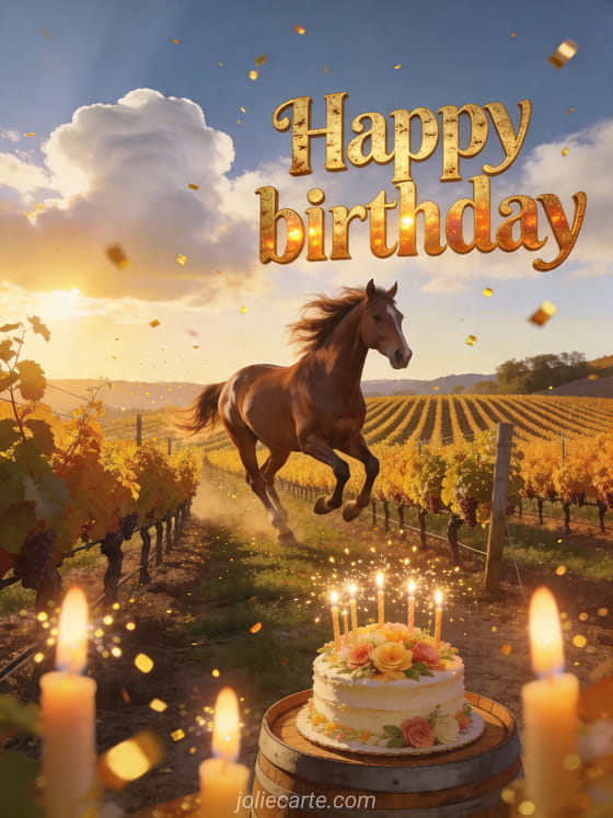 Share a warm birthday wish with this festive card featuring a galloping brown horse in a golden vineyard, sparkling candles, and a flower-decorated cake on a barrel. Discover also birthday gif daughter, happy birthday card little girl and birthday wishes for my daughter.