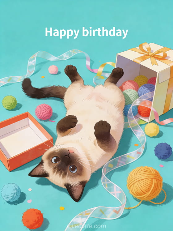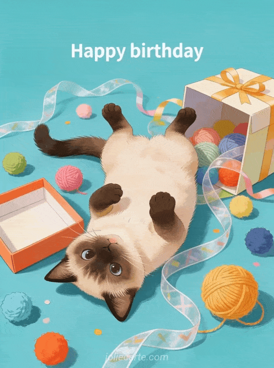 Celebrate with a happy birthday cat animated card featuring a Siamese cat, colorful yarn, ribbons, and festive gifts. Discover also pretty free animated birthday card, anime birthday card, and animated image happy birthday.