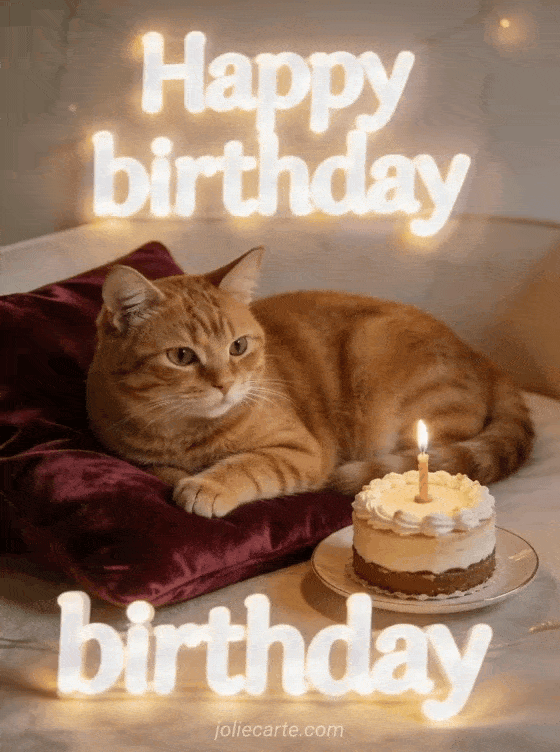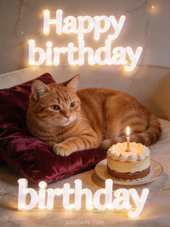 Share a cozy happy birthday with this photorealistic card showing an elegant ginger cat on a velvet cushion beside a little cake in warm light. You can also discover wish somebody happy birthday, happy birthday best friend, or flower woman happy birthday flowers.