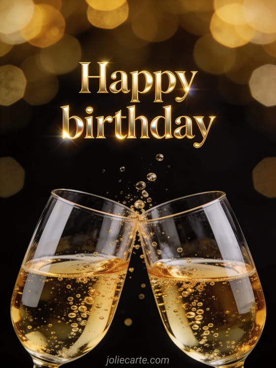 Share a glamorous birthday celebration with two champagne flutes clinking and golden bubbles on a deep black background. Discover also a happy birthday warmest wishes card or a happy birthday flowers card.