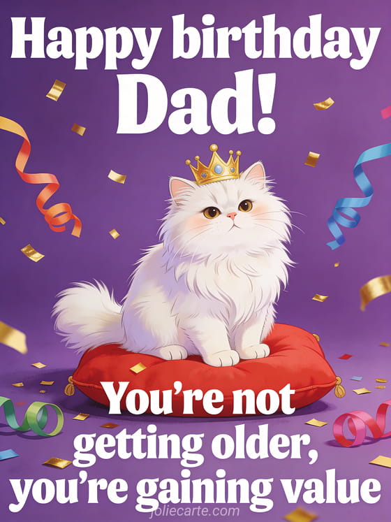 Send a funny happy birthday greeting to Dad with a humorous message: you're not getting older, you're gaining value! Make him laugh on his special day. Discover also a happy birthday Dad text, a birthday drawing for Dad or a birthday message for Dad.