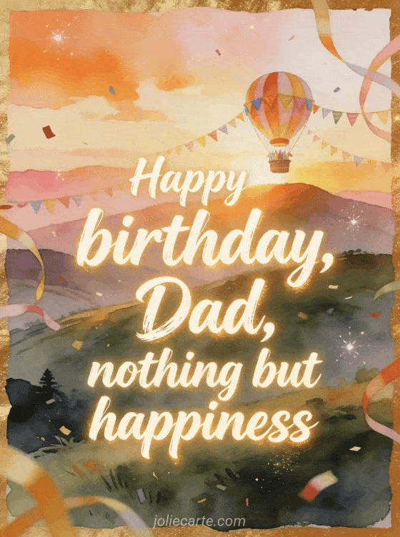 Share a happy birthday dad gif style greeting with a hot air balloon carrying bright birthday pennants above rolling hills at sunrise. You can also send fathers happy birthday dad touching text, happy birthday dad photo montage or happy birthday dad text.