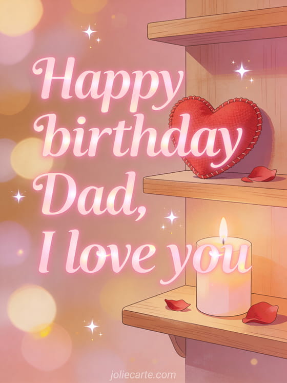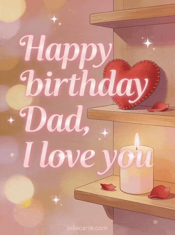 Send a happy birthday dad I love you gif with soft pink luminous lettering, a small red fabric heart on a wooden shelf, a lit candle, scattered rose petals and warm dim light. Discover also a happy birthday dad birthday card, a birthday letter for his dad or a happy birthday stepdad card.