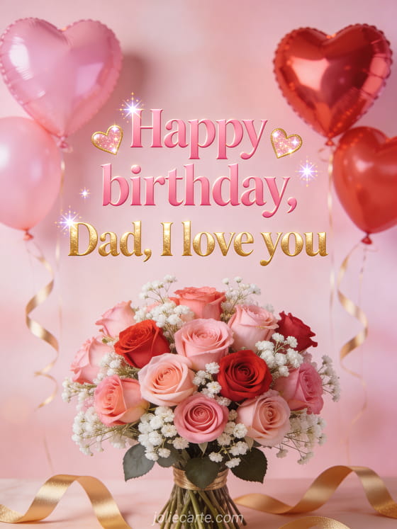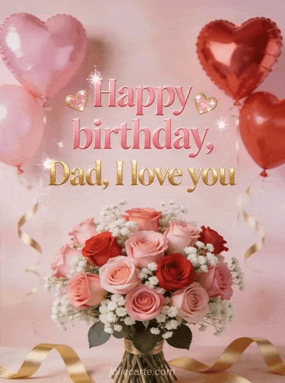 Send a warm happy birthday dad I love you card filled with pink and gold details, roses, sparkling hearts and a festive glow. Discover also a letter for dad's birthday, a happy birthday dad drawing or a happy birthday my dear dad.