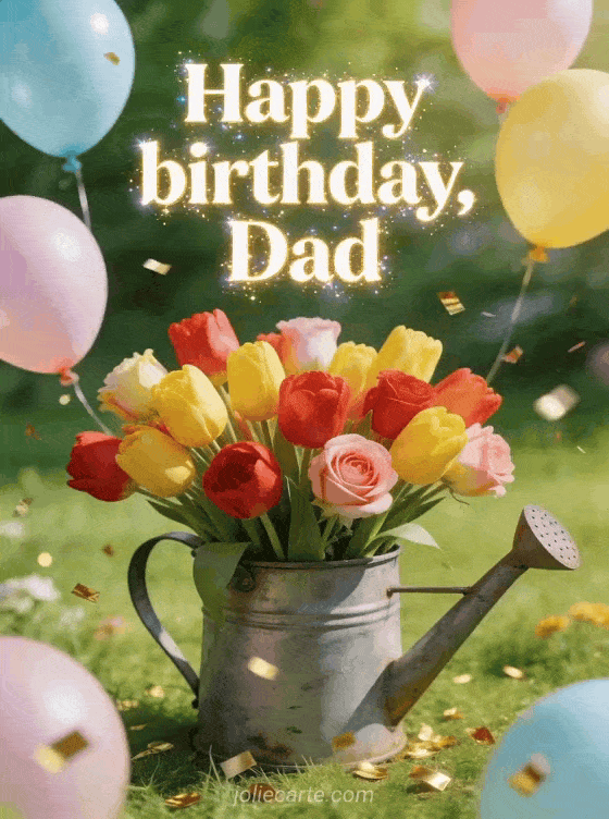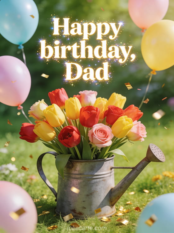Send a cheerful happy birthday dad image with white and gold lettering, multicolored tulips in a vintage watering can, pastel balloons and golden confetti. Discover also a your daughter happy birthday dad, a happy birthday dad I love you or a letter for dad's birthday.