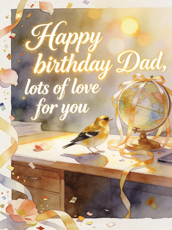 Send a happy birthday dad love card with flowing ivory lettering, a goldfinch beside a vintage globe wrapped in birthday ribbons on a sunlit desk, plus petals, ribbons and confetti over the border. Discover also a happy birthday father-in-law poem, a happy birthday dear dad poem or a birthday poem for dad I love you.
