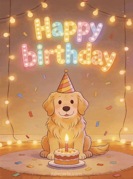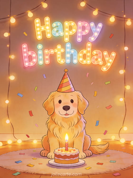 Make someone smile with this festive birthday card and its heartwarming golden retriever illustration. Discover also a happy birthday drawing, a happy birthday princess or phrase to wish happy birthday.