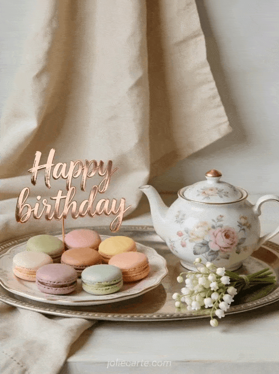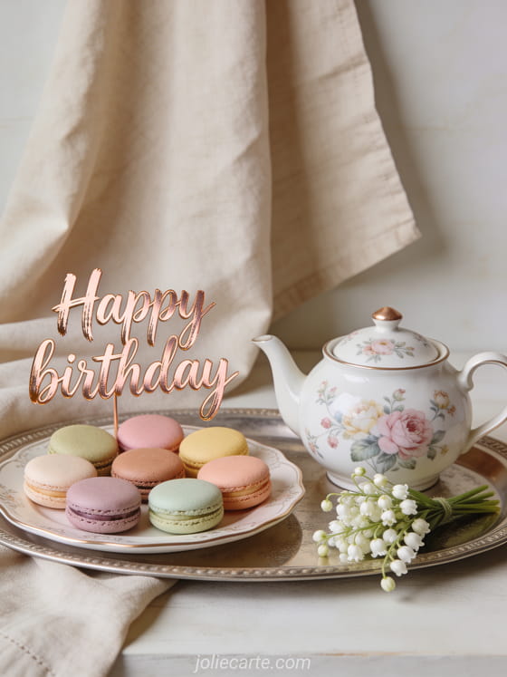 Share this photorealistic birthday card with colorful macarons, a floral teapot, and lily of the valley for a refined celebration. You can also browse dromedary birthday card woman, friend birthday woman friend, and gif happy birthday woman humor.