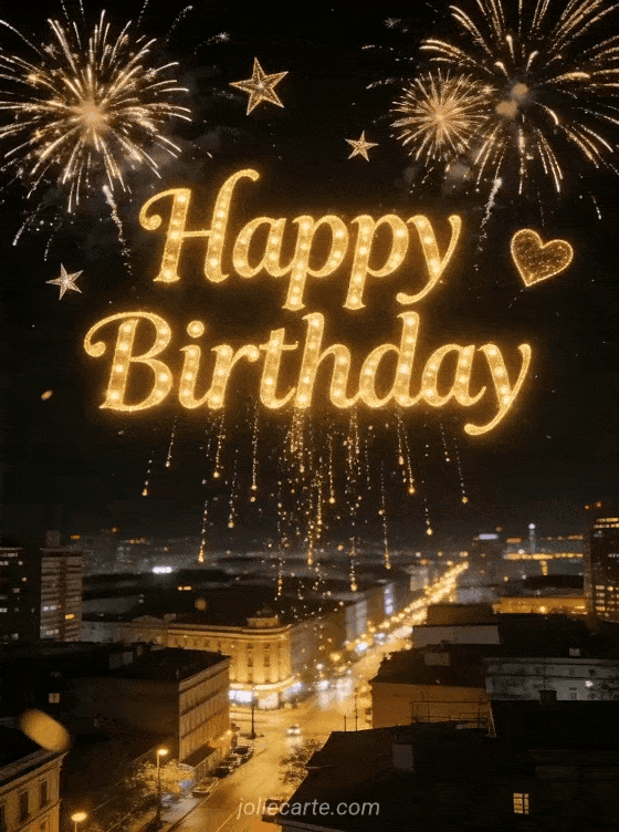Dazzle them with this spectacular animated gif featuring golden fireworks exploding above an illuminated night city. Discover also a happy birthday animated gif or a happy birthday animated image.