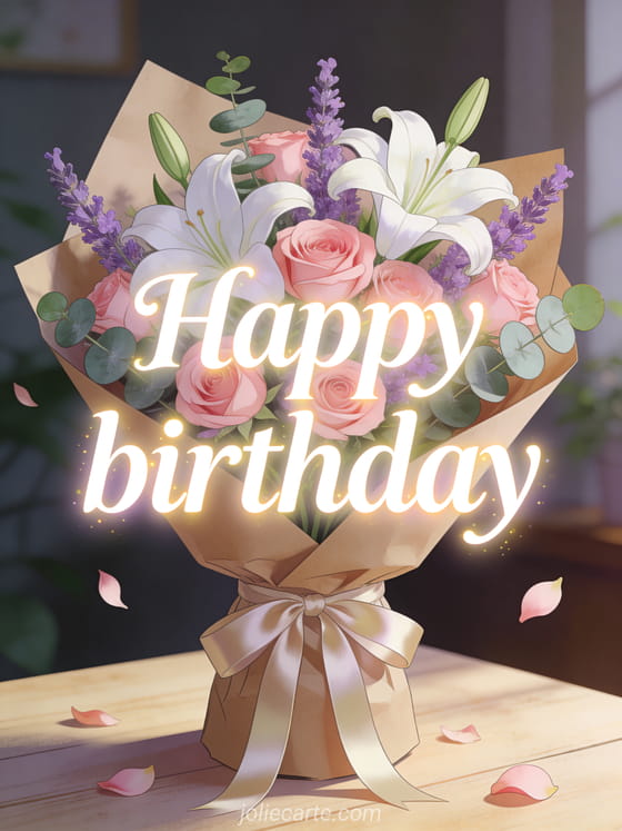 Share a happy birthday flower bouquet card with elegant roses, white lilies, lavender, eucalyptus, and soft natural light on a wooden table. You can also discover a happy birthday, happy birthday gif red, and very happy birthday.