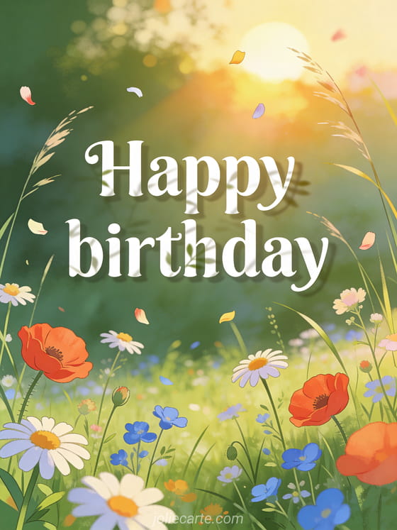 Celebrate with a happy birthday flowers nature card featuring poppies, daisies, and countryside sunset charm. Discover also happy birthday with coronavirus mask, sms to wish a happy birthday, and happy birthday color drawing.