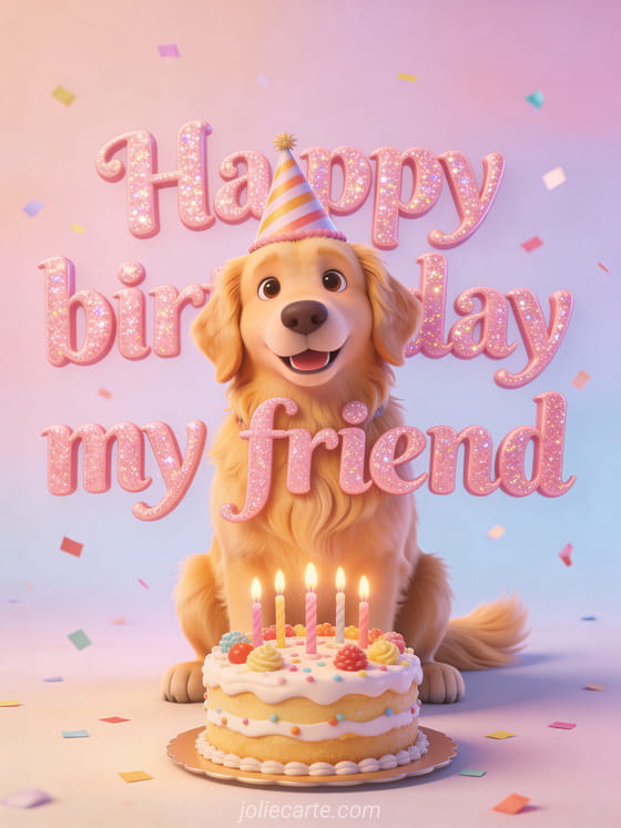 Make your friend smile on their birthday with this delightful card featuring an adorable golden retriever wearing a party hat, sitting in front of a birthday cake decorated with candles, surrounded by confetti and a pastel background. Discover also a birthday wish for a friend or a happy birthday card my girlfriend.