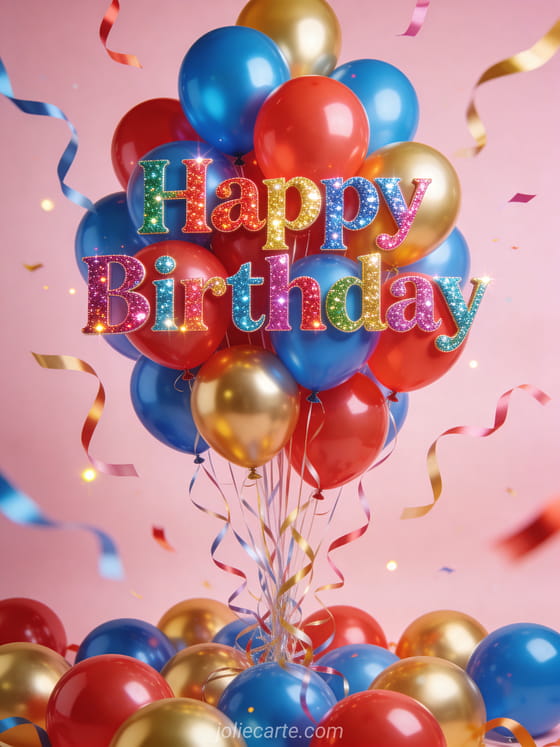 Send this festive happy birthday gif with multicolored glitter letters, a cascade of balloons and flying ribbons. Discover also a gif happy birthday or a happy birthday card.