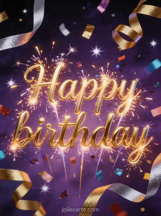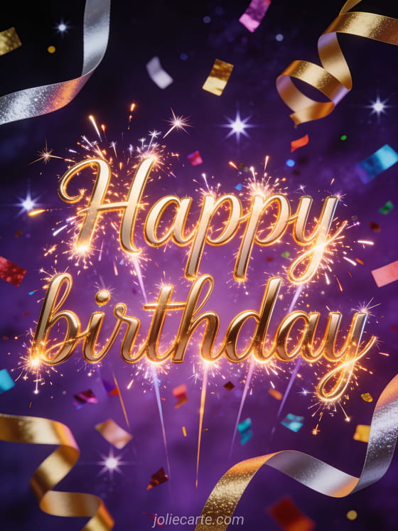 Share a glamorous birthday card with golden firework-style lettering, colorful confetti, silver and gold streamers, and sparkling stars on a deep purple night background. Discover also a sms to wish happy birthday to my son, a birthday card my son, or a birthday son card.