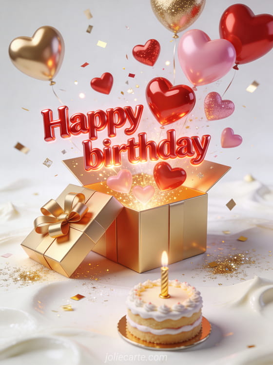 Send a joyful romantic birthday card with glossy red lettering, 3D hearts bursting from a golden gift box, heart balloons and a small birthday cake with a candle. Confetti and glitter make the scene bright and festive. Discover also happy birthday my sweetheart image, heart happy birthday heart or happy birthday my sweetheart images.
