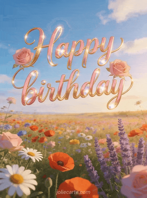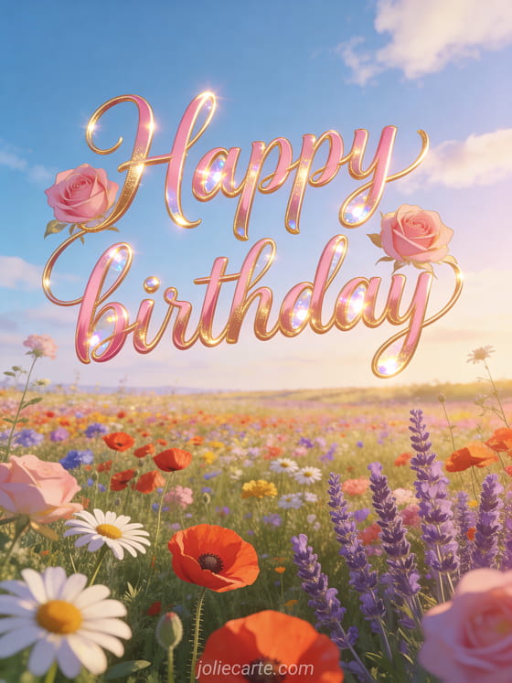 Celebrate with a radiant birthday card showing a flower field under blue sky, with poppies, daisies, lavender, and golden afternoon light. You can also discover musical happy birthday, happy birthday images, and happy birthday cat image.
