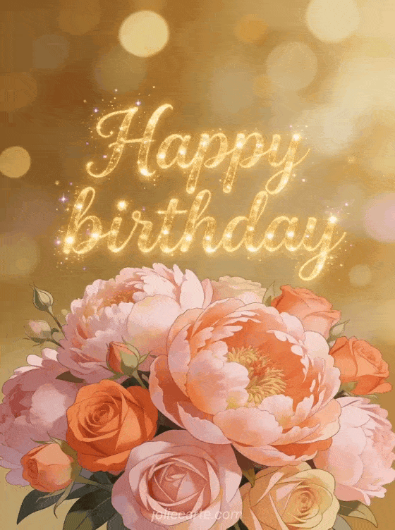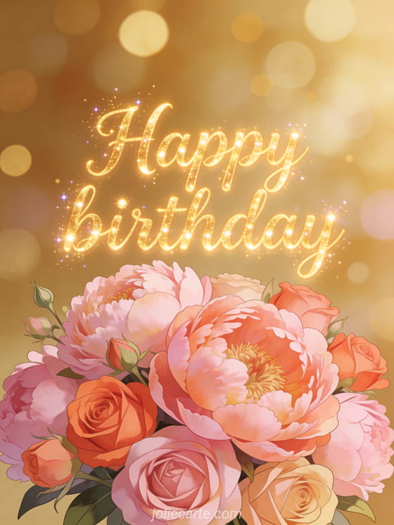 Share a stunning happy birthday image with a gorgeous bouquet of peonies and roses in powdery pink and coral tones against a warm golden bokeh background. Discover also a pink happy birthday card or a happy birthday share on facebook card.