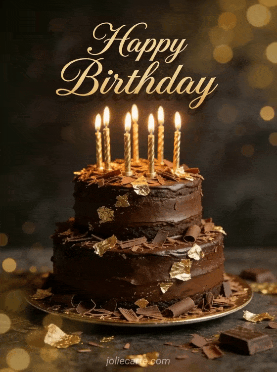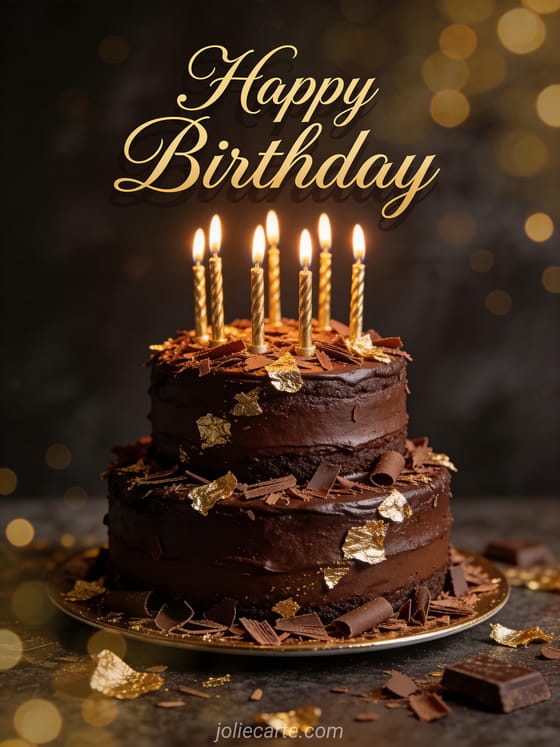 Celebrate his birthday with this elegant card featuring a luxurious dark chocolate cake with golden candles and gold leaf decorations. Discover also a funny birthday message for him, a funny birthday card for men or a champagne birthday card for a man.
