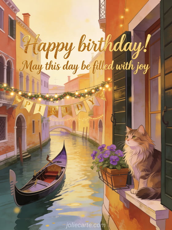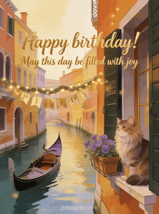 Share a beautiful birthday wish with this elegant card and its romantic canal atmosphere. You can also send happy birthday chocolate, happy birthday beach sun, or free happy birthday gif.