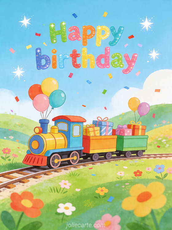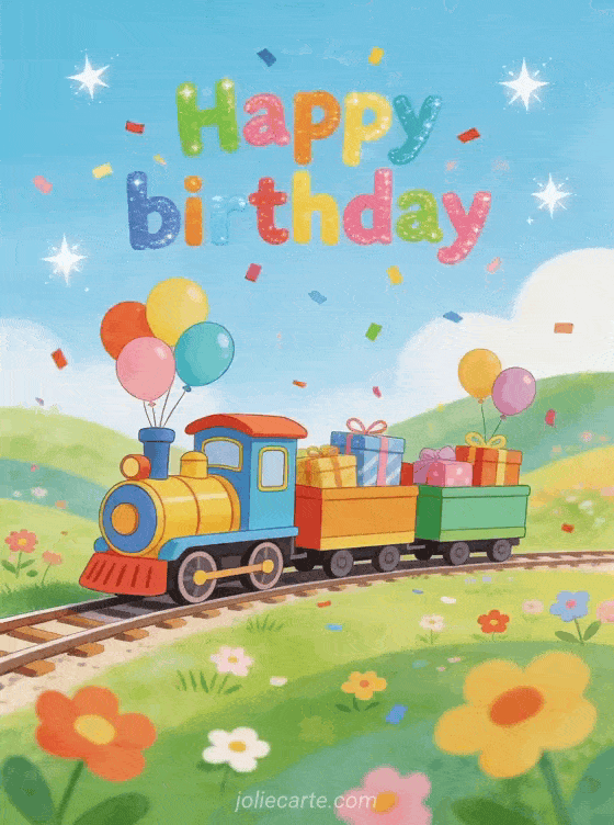 Make the day more playful with this joyful birthday card featuring a colorful train full of gifts and balloons. Discover also a happy birthday sms, a happy birthday girly or musical happy birthday.