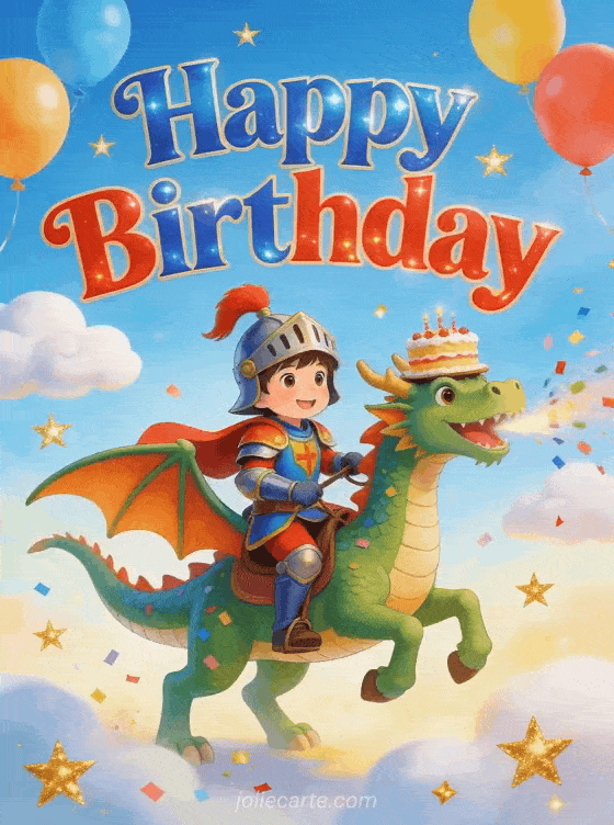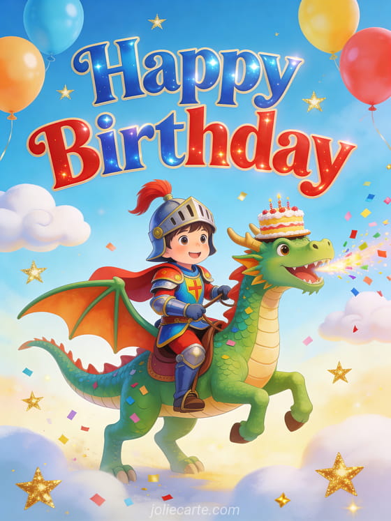 Send this enchanting happy birthday card featuring a brave little knight riding a friendly confetti-breathing dragon. Perfect for a child's special day. Discover also a birthday card template for children or a birthday card photo for kids.