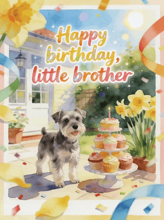 Send a colorful birthday greeting to your little brother with a miniature schnauzer in a sunny courtyard, a cupcake tower, daffodils and bright ribbons. Discover also a happy birthday sms for his big brother, a happy birthday bro gif or a happy birthday little brother image.