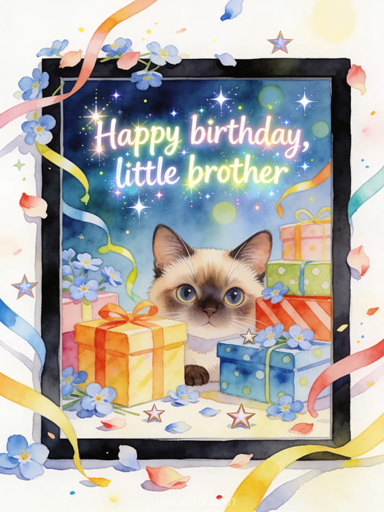 Send a whimsical birthday greeting to your little brother with an exotic shorthair cat peeking from behind stacked presents, forget-me-not petals and bright streamers. Discover also a birthday brother gif, a brother birthday quote or a happy birthday my big brother.