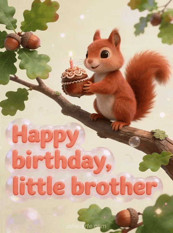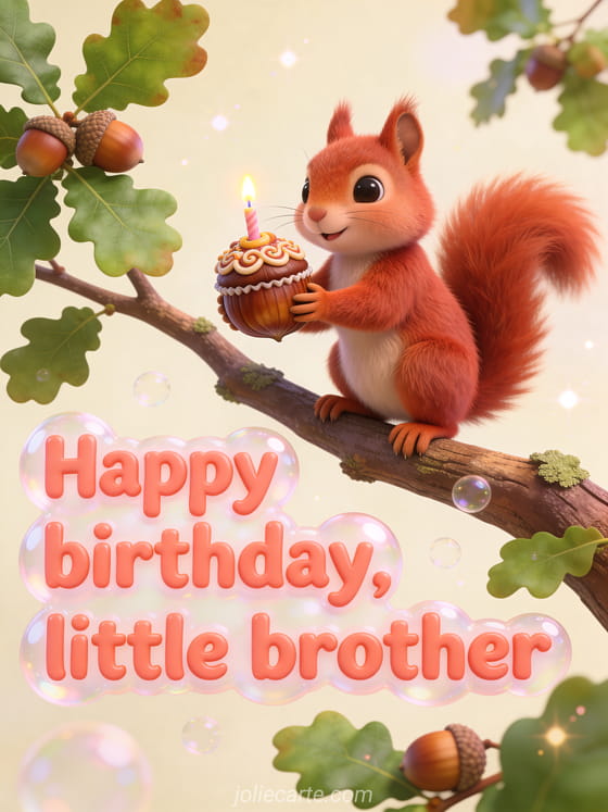 Send a playful birthday card with a red squirrel holding a hazelnut decorated like a tiny cupcake, perched on an oak branch. You can also share a birthday little brother, a birthday brother or a happy birthday my big brother card.