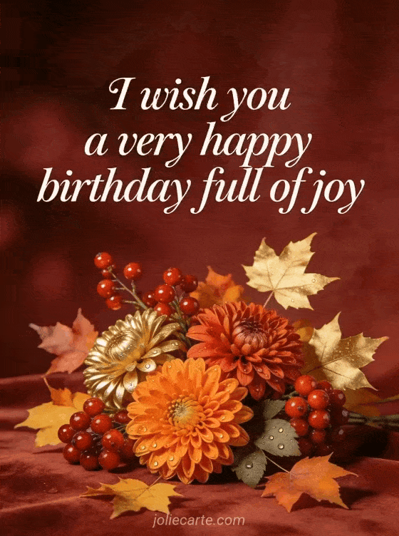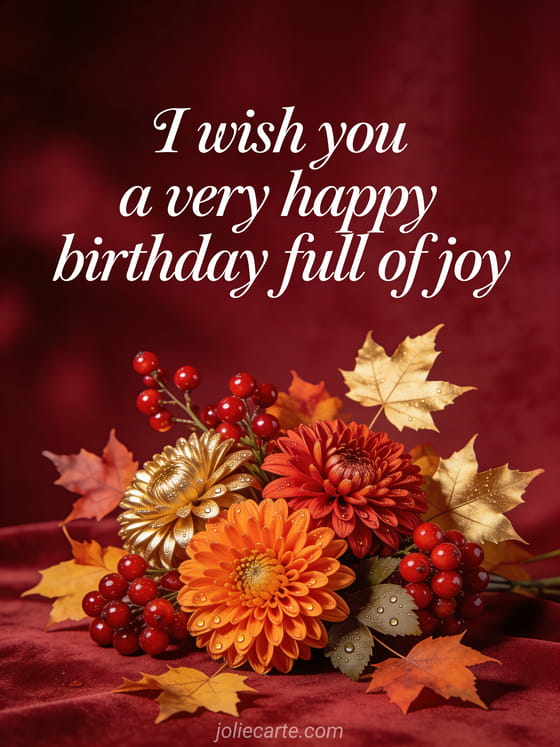 Send this beautiful birthday message card with white calligraphy on a velvety bordeaux background, featuring autumn flowers with chrysanthemums, red berries and golden leaves in warm light. A free photorealistic card perfect for her. Discover also birthday flowers for women or beautiful free birthday card for women.
