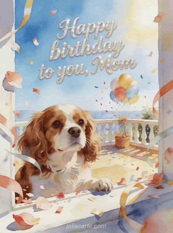Share a cheerful birthday wish for mom with pearl calligraphy, a Cavalier King Charles spaniel, petals, streamers, balloons, and bright confetti on a sunlit terrace. You can also send a text to say happy birthday to your mom, an animated happy birthday mom gif gif, or a happy birthday mom simple text.