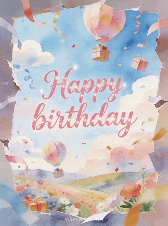 Share a joyful birthday greeting with airy rose script, pastel hot air balloons carrying tiny gift boxes, a blooming valley, streamers, confetti, bright clouds, and a radiant festive sky. You can also send birthday wishes for mom, a sparkling happy birthday mom gif, or a happy birthday mom birthday text.